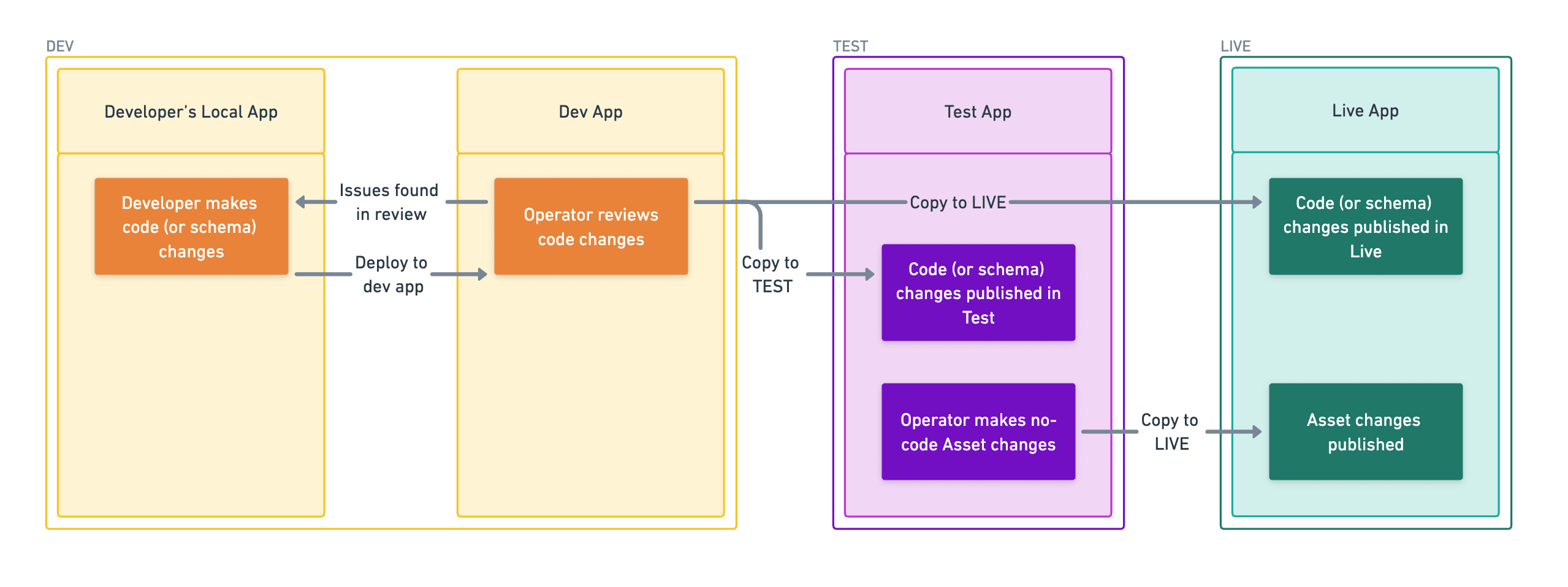• code changes are made and reviewed in Dev, and get pushed from Dev to Test and Live