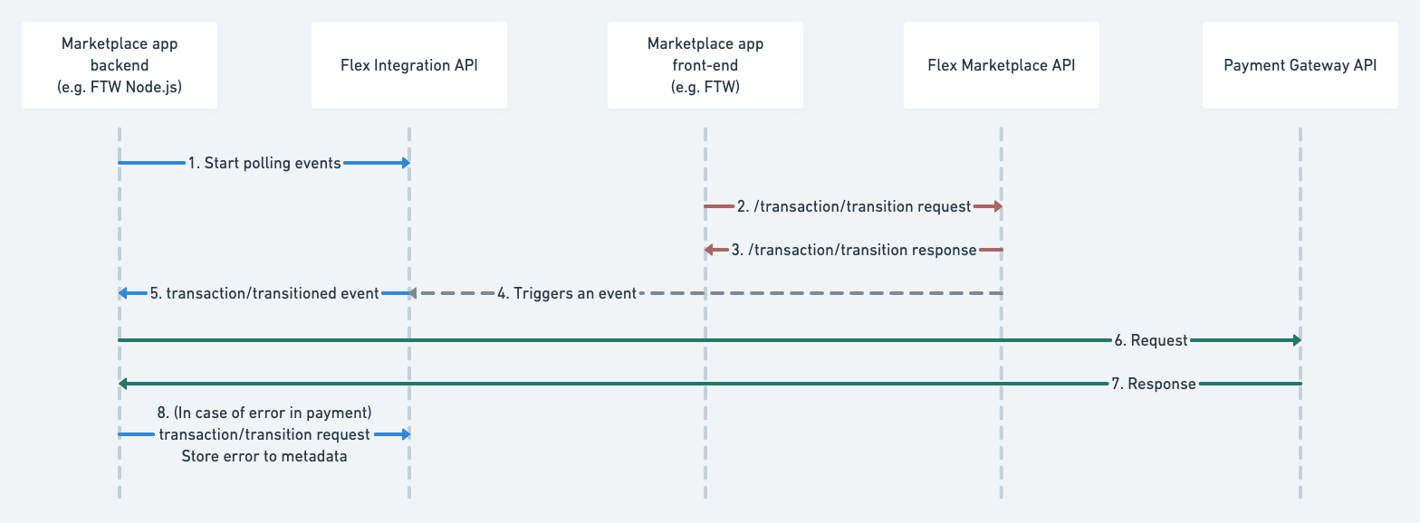Error handling in this model is simple. Because all the calls to the Flex Marketplace API and the payment gateway's API are triggered by the request of the end-user, your marketplace front-end can immediately return a failure response and show an error message to the user when things go wrong.